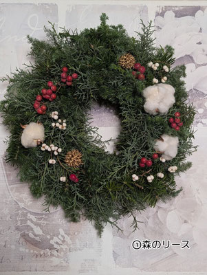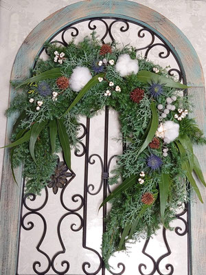 森林浴の清々しい香りとともにシンプルなグリーンリース。サンキライ、南京ハゼの実、コットンをつけて制作。(写真A約30cm)