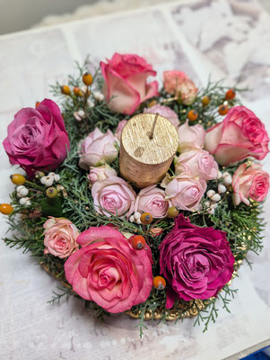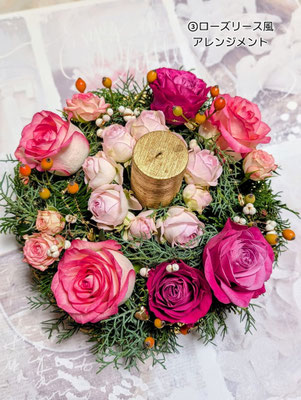 ピンク系バラを入れた華やかなリース風アレンジメント。テーブル装花にオススメです。