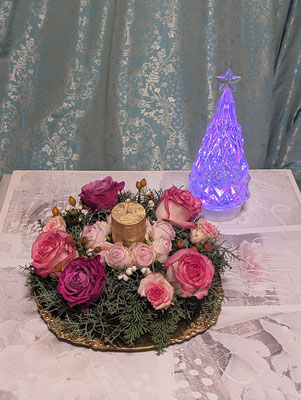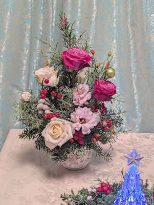 ツリー風アレンジメント、リース風アレンジメントはどちらもフレッシュ薔薇を入れています。